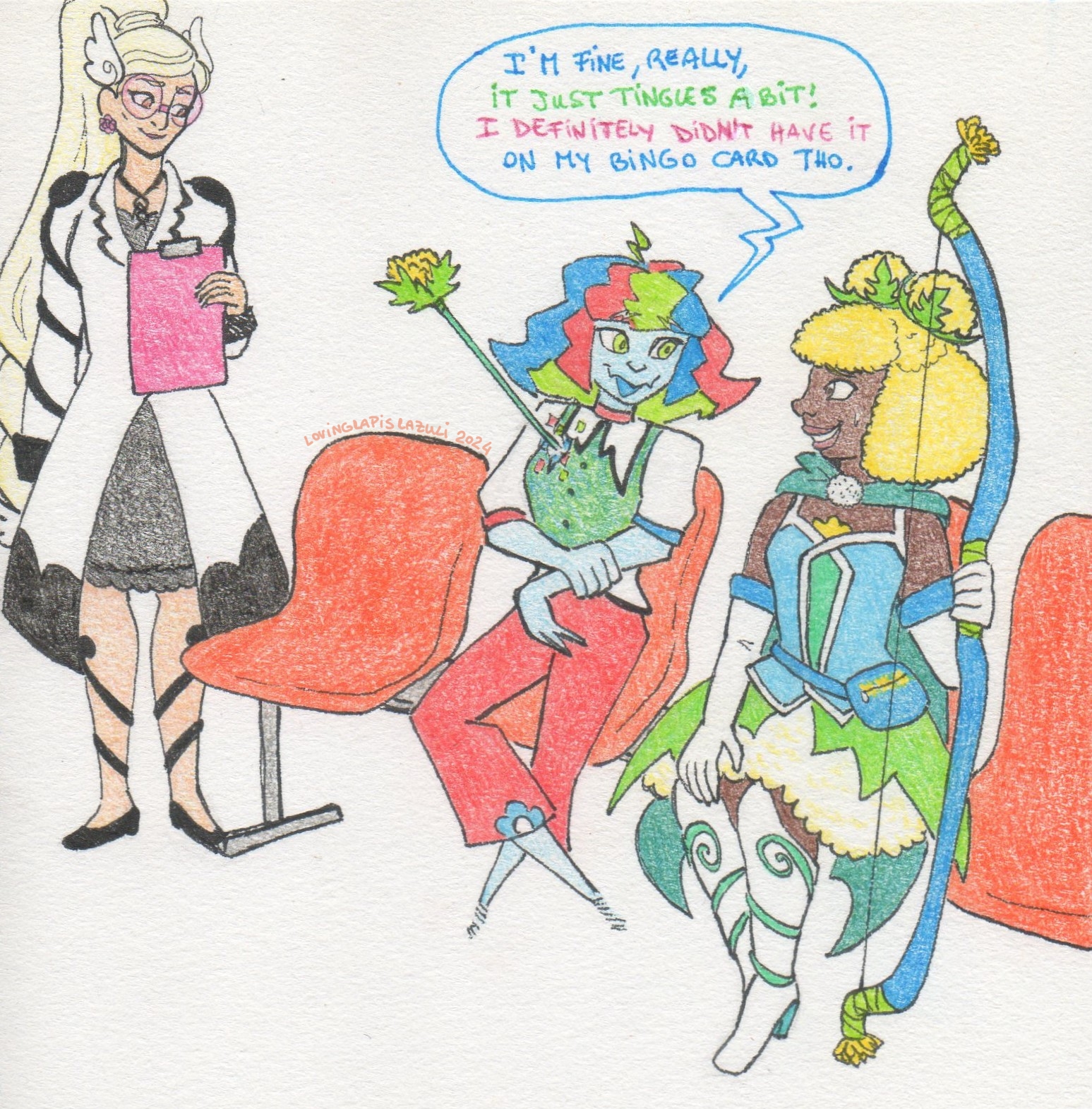Dhalia is a dandelion themed magical woman and together with her team she looks for magical items to bring them to the Archive, a place where anyone can borrow them akin to a library. Her magic fannypack is a hammer space full of useful things she can fish out! Thanks to the magic bow she can conjure up, she finally has a great excuse to learn archery like she's dreamed for a while :D Very sweet and kind, she is resourceful and likes being prepared for almost anything!
